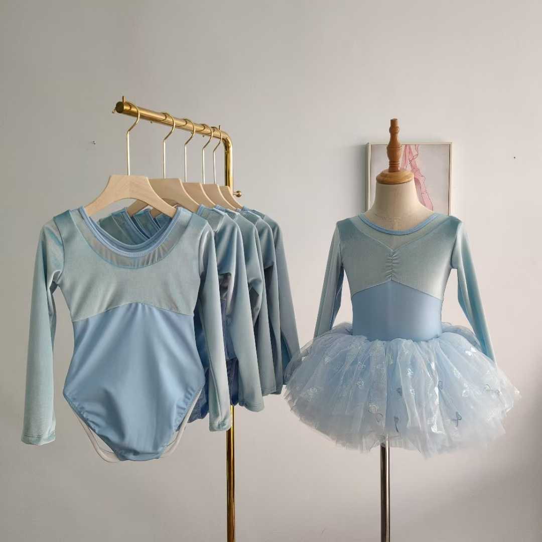 Girls Blue Long Sleeves Dance Leotard Tutut Dress Princess Party Ballet Costume Dress