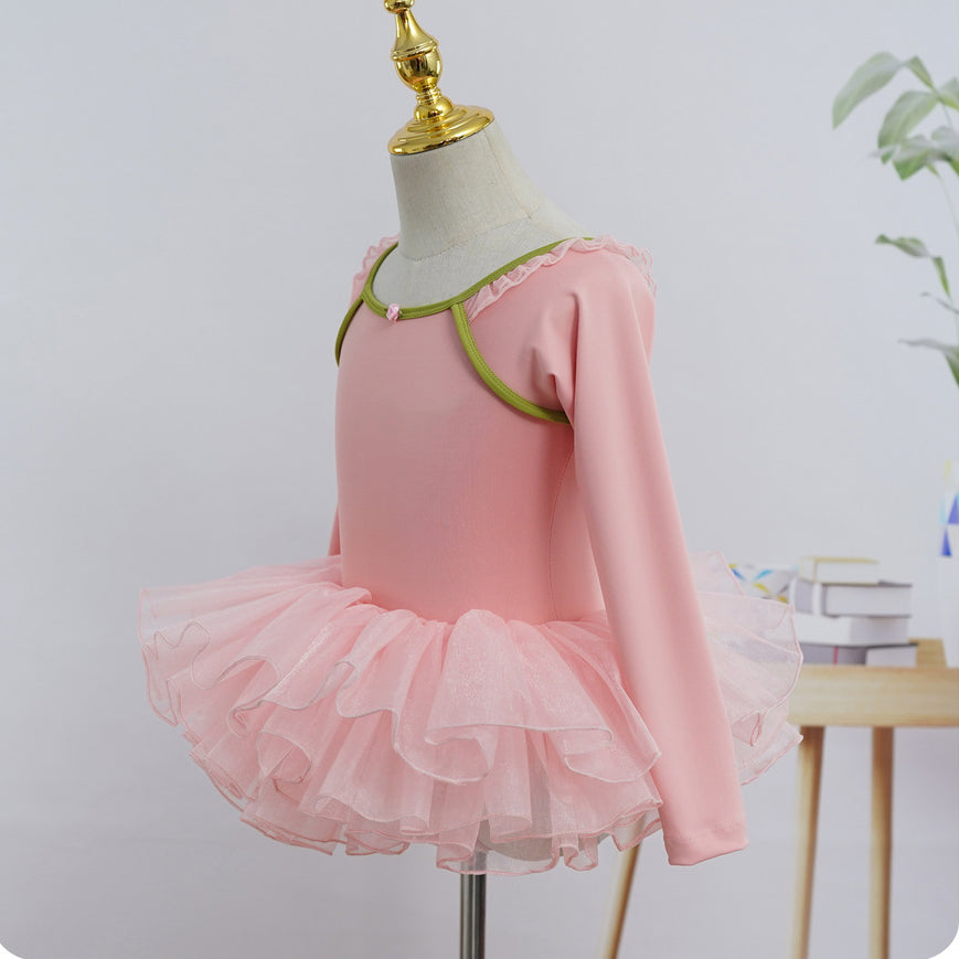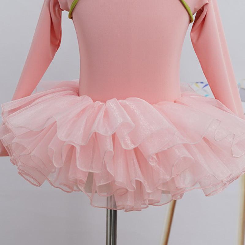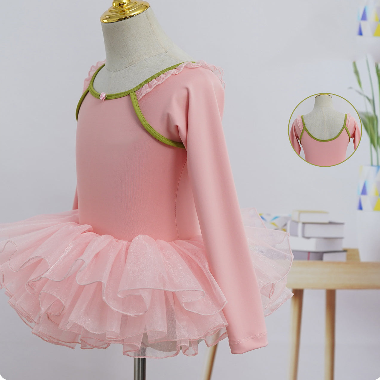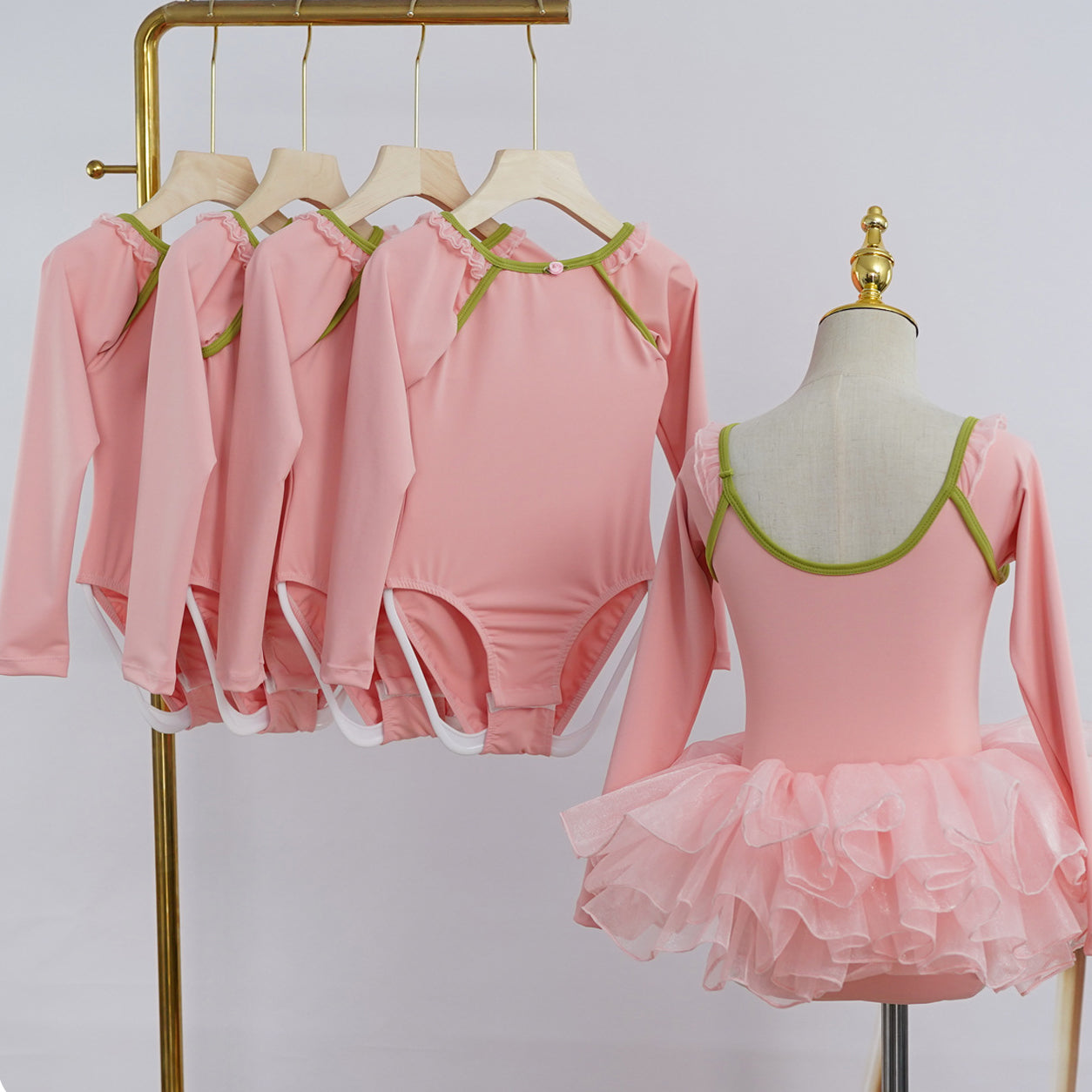 New Design Girls Long Sleeve Ballet Training Dance Wear 2 Piece Set Gymnastic Leotard with Skirt Pink
