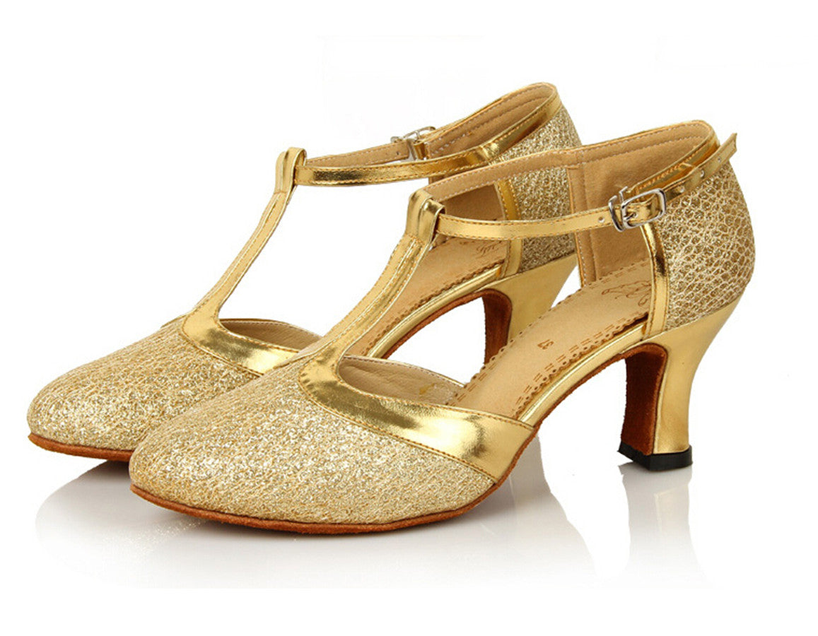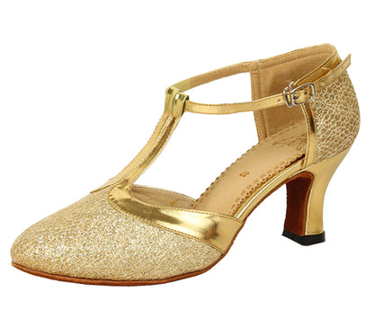Womens Glittering T-Strap Latin Dance Shoes Closed-Toe Ballroom Salsa Wedding Dance Sandals